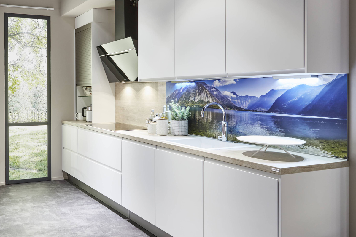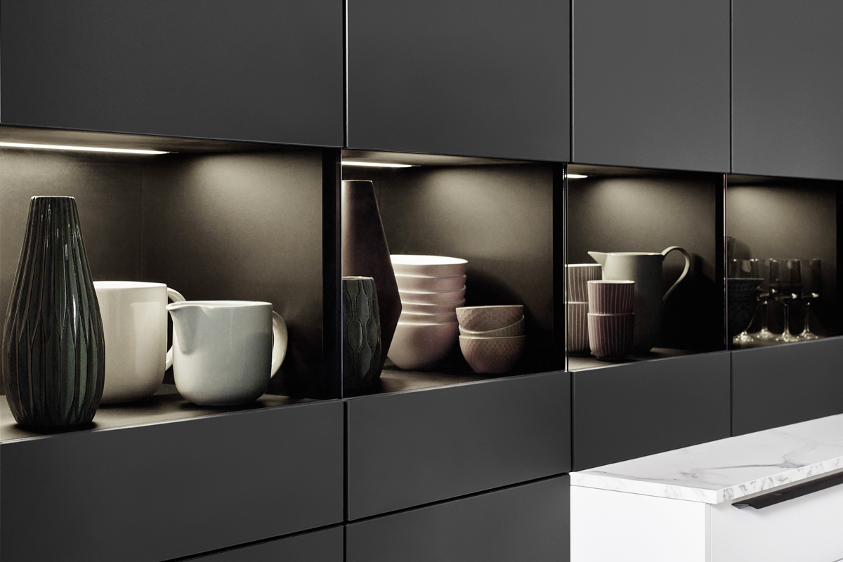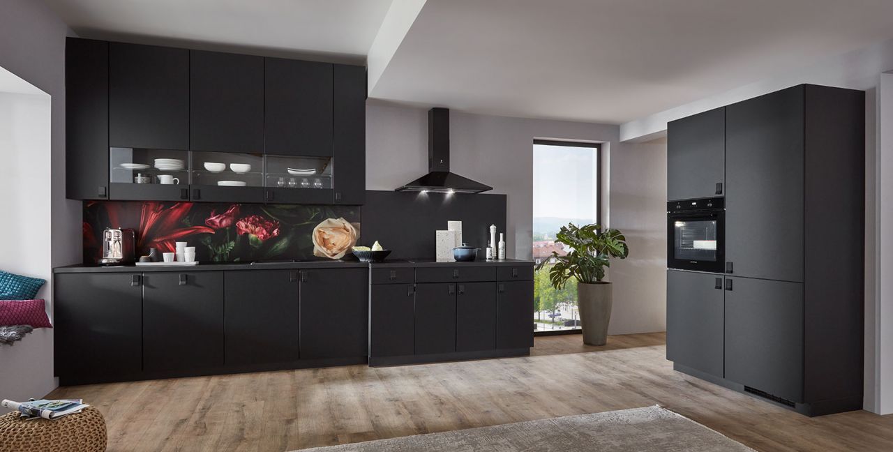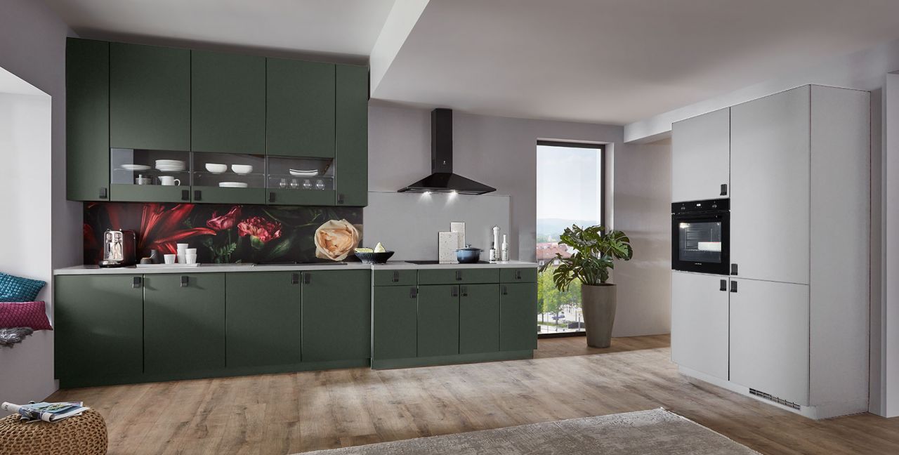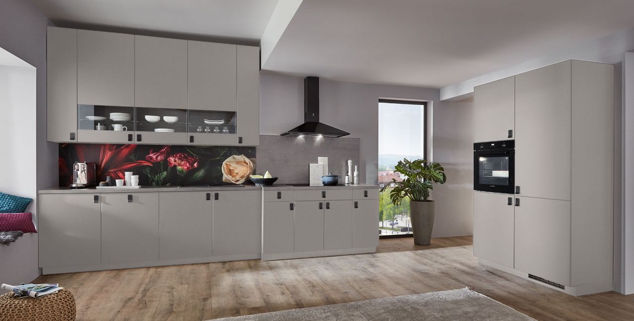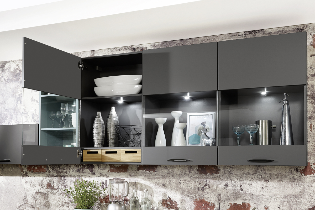 Inklusive Einbaubackofen Laurus LEB10BK Energieeffizienzklasse A, Glaskeramik Kochfeld Laurus LCA600, Dunstesse Edelstahl Elica MISSY BL90-D Energieeffizienzklasse D, Kühlschrank Laurus LKG122E Energieeffizienzklasse E, Einbau-Designspüle Elleci Logik 300, XL-Schränken, Wandschrank mit Segmentglastüren.